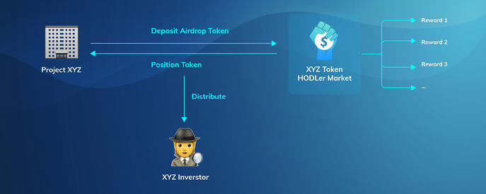 Option 2 is linear vested airdrop rewards. Projects can also choose to have their airdrop reward tokens linearly vested over a certain period. They can configure the market with their airdrop token as a reward token. Once they deposit the airdrop token into the HODLer Market, a position token will be generated. Airdrop participants can deposit the position token in the HODLer Market and receive the airdrop token.