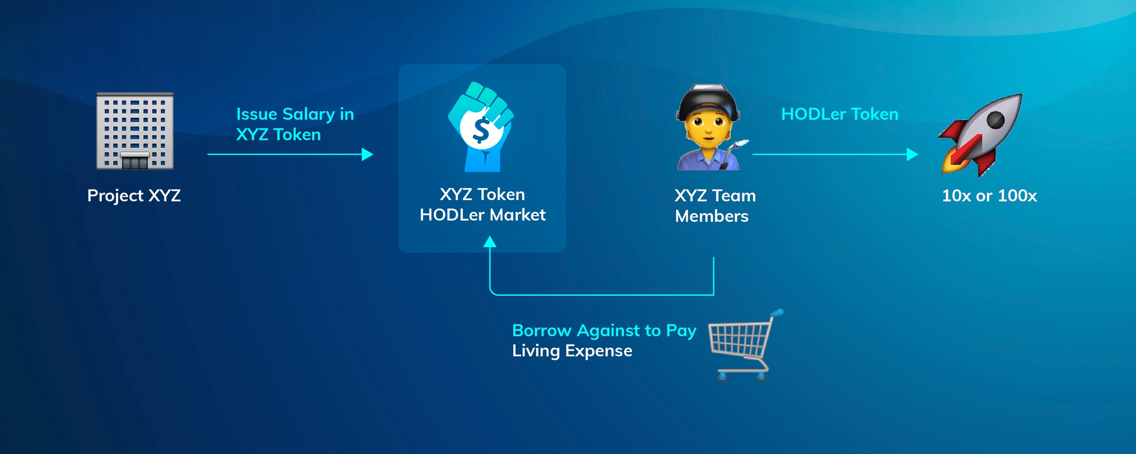 With a HODLer market, projects can define a locking period for their native token when issuing tokens as a salary. Since the locked position can be used as collateral, team members can easily borrow against it. In this case, even risk-averse team members don't have to worry about running out of grocery money if they don't sell the tokens right away. They can hodl on without any pressure and count on a 10x or 100x return because of their hard work and contribution to the project.